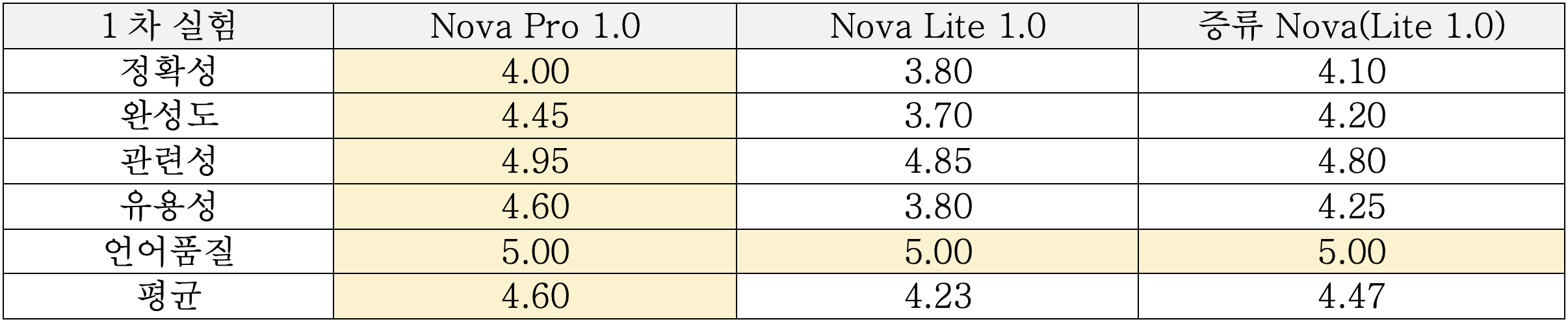 평가는 2차례 실행하였으며 결과를 요약해보면, 전체 평균 점수는 증류 Nova와 Nova Pro 모델이 비슷한 수준의 성능을 보였고, Nova Lite는 두 모델 대비 낮은 성능을 보였습니다. 증류 Nova 모델은 동일 아키텍처 모델인 Nova Lite 대비해서는 성능이 많이 개선되었습니다.