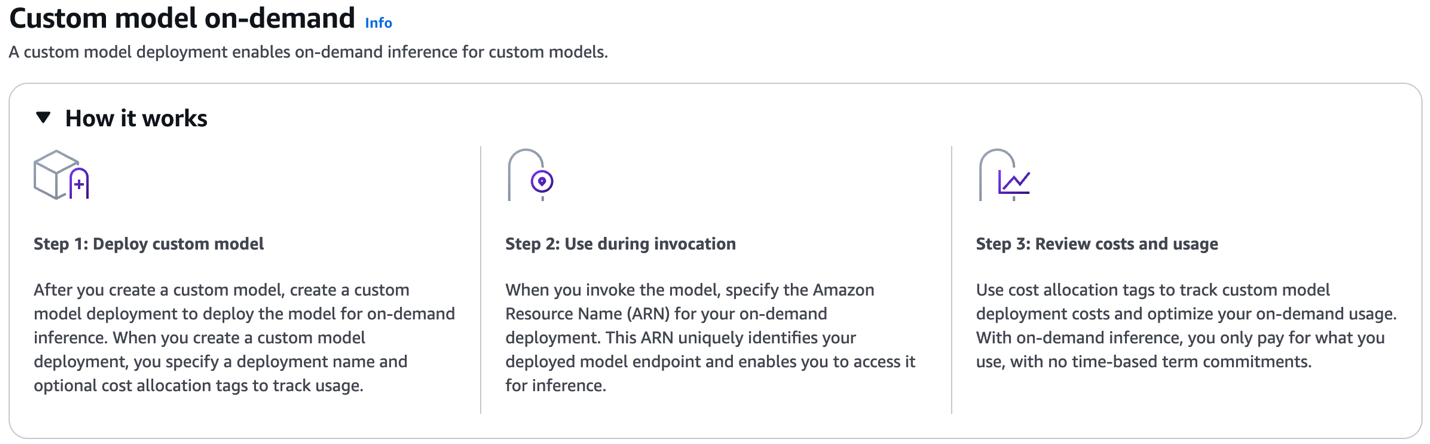 Amazon Bedrock은 기업이 자체 모델을 구축할 수 있도록 지속적인 사전 훈련(Continued pre-training), 미세 조정(Fine-tuning), 지식 증류(Knowledge distillation)라는 세 가지 유형의 모델 커스터마이제이션 기능을 제공합니다. 2025년 7월, 이러한 커스텀 모델을 위한 커스텀 모델 온디맨드(Custom model on-demand) 배포 기능이 새롭게 출시되었습니다. 이전에는 Bedrock에서 학습한 커스텀 모델을 배포할 때 사전 용량 예약 방식인 프로비전드 처리량 모드(Provisioned Throughput mode)만 지원했었습니다. 이번 새로운 기능 출시로 커스텀 모델을 온디맨드 방식으로 배포할 수 있게 되었으며, 모델 배포 후에는 기본(Base) 모델 기준으로 과금 됩니다. 이를 통해 비용 효율적으로 빠른 실험과 운영이 가능 해졌습니다.