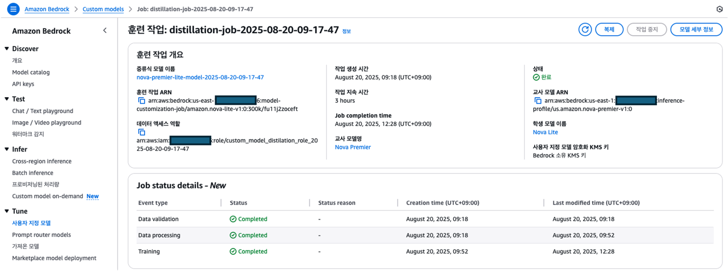 지식 증류 작업 실행 후 진행 상황은 Amazon Bedrock 콘솔 (Amazon Bedrock > Custom models > Job)에서 확인할 수 있으며, AWS CLI 명령으로도 조회할 수 있습니다.