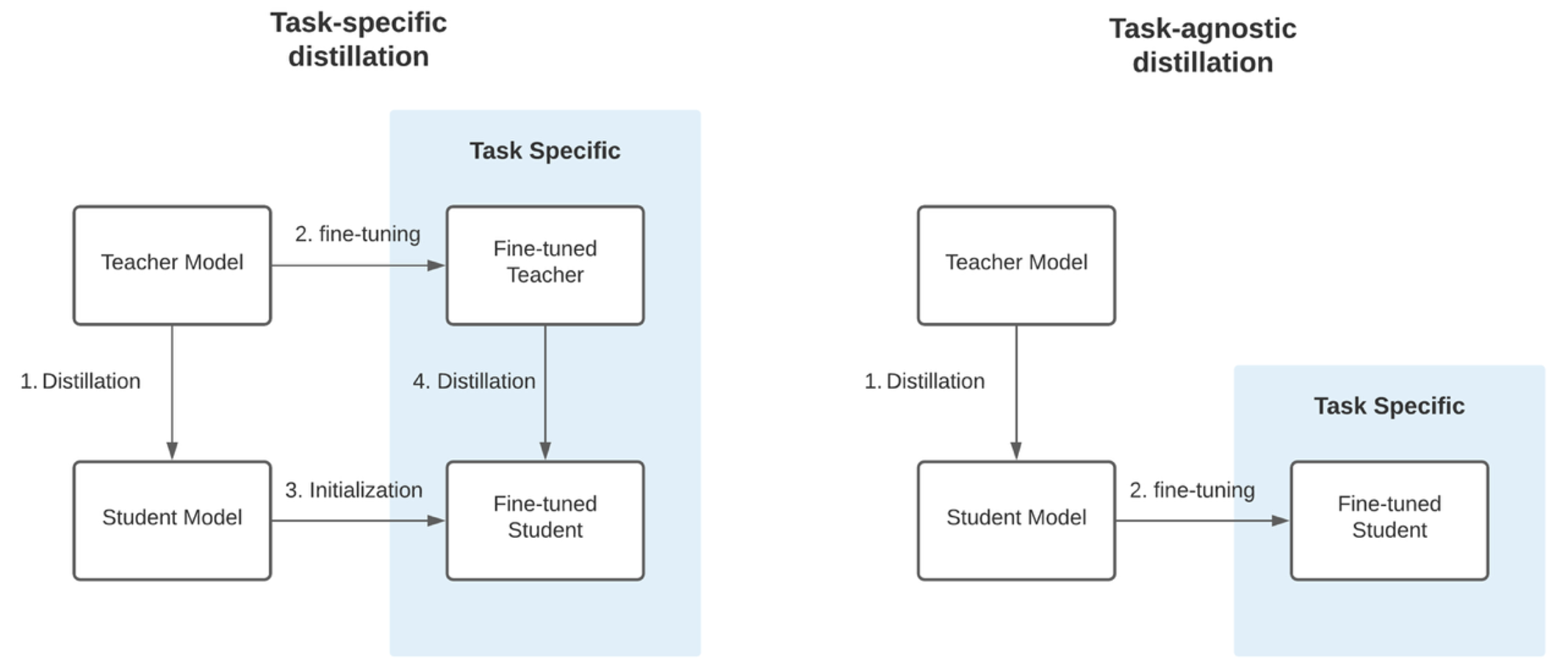 LLM의 성능을 개선하는 데 많이 활용되는 모델 커스터마이제이션 방법으로 미세 조정과 지식 증류가 있습니다. 미세 조정은 이미 사전 학습된 모델을 특정 작업이나 도메인에 맞게 추가로 훈련시키는 과정입니다. 이 과정에서 모델은 원래의 크기와 복잡성을 그대로 유지하면서 특정 작업에 대한 성능이 향상됩니다. 반면 지식 증류는 큰 모델(교사 모델)의 지식을 작은 모델(학생 모델)로 전달하는 기술입니다. 이는 마치 경험 많은 선생님이 학생에게 지식을 전수하는 것과 비슷합니다. 대규모 데이터셋으로 사전 훈련된 교사 모델이 입력에 대하여 출력을 생성하면, 이 출력이 학생 모델의 학습 데이터로 사용됩니다. 작은 학생 모델은 이 데이터를 사용해 교사 모델의 행동과 예측을 모방하도록 훈련됩니다. 이렇듯 미세 조정이 모델의 크기를 유지하면서 특정 작업에 대한 성능을 향상시키는 것이라면, 지식 증류는 모델의 크기를 줄이면서 성능을 최대한 유지하는 것이 목적입니다. 모델 크기가 작아져 제한된 환경에서도 쉽게 배포할 수 있고, 운영 비용도 절감됩니다. 또한 작은 모델은 지연 시간이 낮고 처리량이 높아 성능 면에서도 이점이 있습니다. 아래의 그림처럼 지식 증류에는 2가지 접근 방법이 있습니다. 작업 특화 증류(Task-specific distillation)는 대형 모델을 특정 작업에 미세 조정 후, 그 지식을 작은 모델로 증류하여 특정 작업에 최적화된 모델을 만들고요. 작업 독립(Tast-agnostic)은 미세 조정 단계 없이 바로 특정 작업에 최적화된 증류 작업을 실행하는 방식입니다.