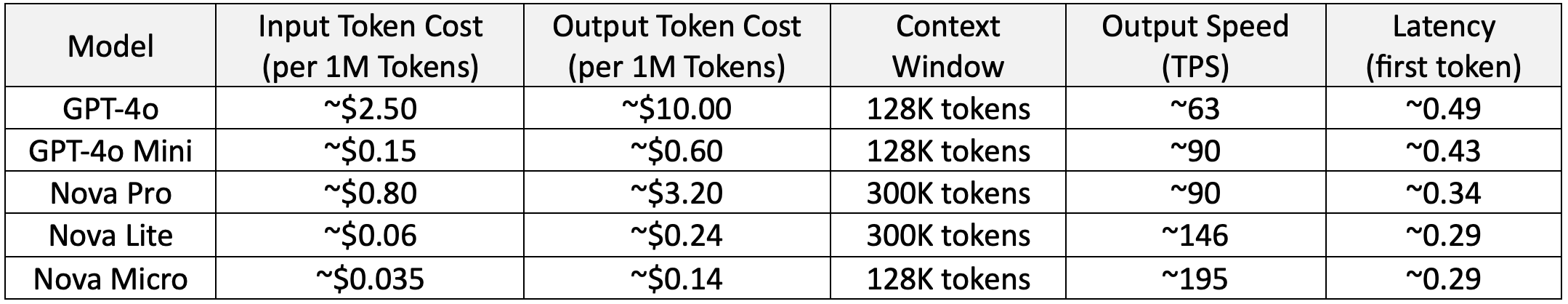 비즈니스 환경에서는 비용과 응답속도도 중요한 고려 사항이며, 이 영역에서 지식 증류의 장점은 명확합니다. 증류 Nova 모델은 Nova Premier의 지식과 전문성을 효과적으로 흡수하면서, Nova Lite 수준의 콤팩트한 모델 크기와 운영 비용, 그리고 응답속도를 그대로 유지합니다. 아래 데이터를 보면, 증류 Nova Lite는 Nova Pro대비 약 13.3배 더 저렴한 비용으로 운영 가능합니다. 입력 토큰 비용은 Nova Pro의 $0.80 대비 $0.06으로 낮고, 출력 토큰 비용 또한 $3.20에서 $0.24로 줄어듭니다. 응답속도 측면에서도 Nova Lite는 초당 약 146개 토큰을 처리하여, Nova Pro의 90개 토큰 대비 약 1.6배 빠른 처리 속도를 보여줍니다. 증류 Nova 모델의 경우 LoRA 어댑터를 활용함으로써 일반 Nova Lite 모델 대비 약간의 오버헤드는 있으나, 여전히 Nova Pro 대비 매우 저렴한 비용과 빠른 속도를 유지하면서 지식 증류의 비즈니스 가치를 잘 보여줍니다.