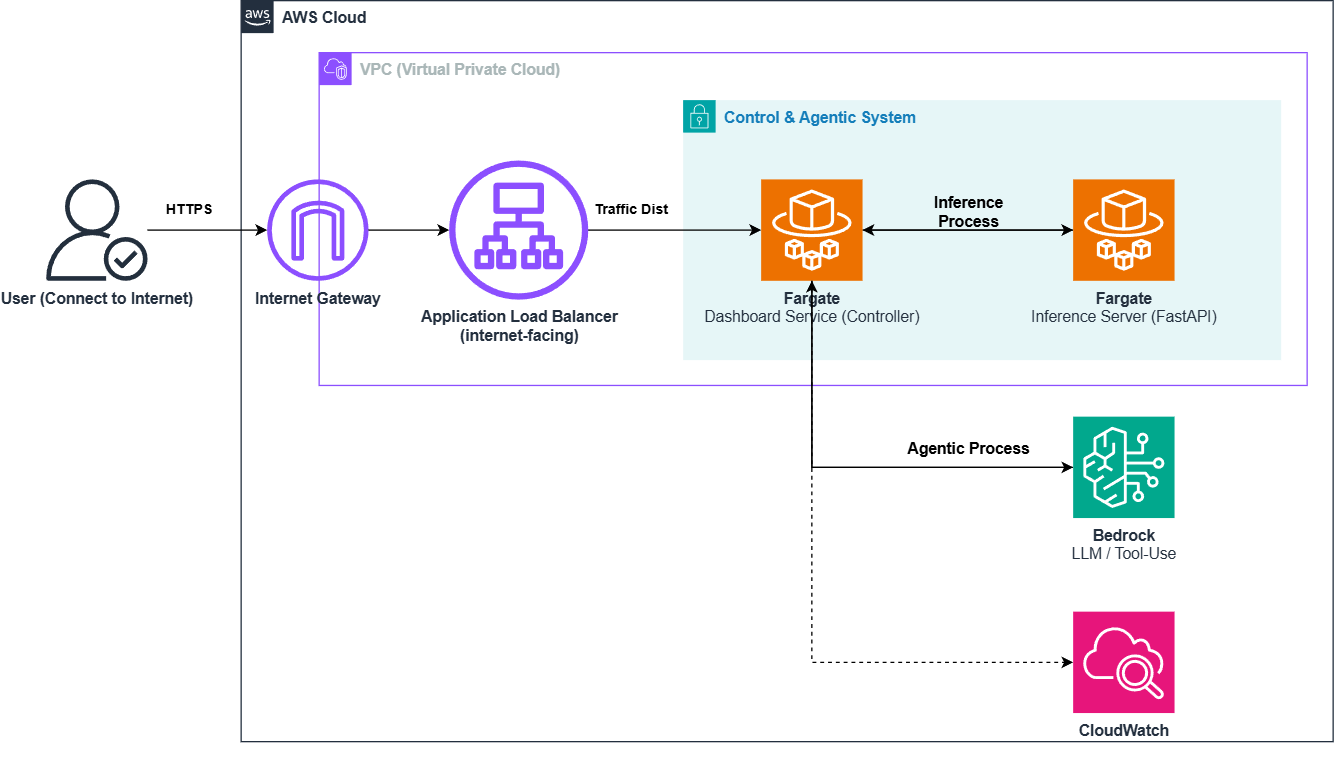 시스템은 크게 사용자 접점 (Dashboard), 연산 엔진 (Inference Server), 제어 지능(Amazon Bedrock Agent)로 구성됩니다.
