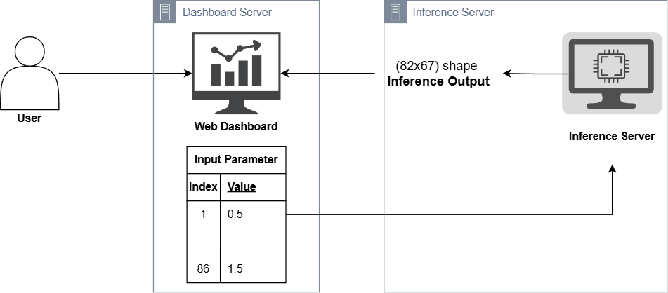 사용자의 예측 요청이 들어오면 Dashboard 는 86개의 파라미터를 수집하여, Inference Server 로 전송합니다. 서버는 메모리에 상주된 TensorFlow 모델을 통해 대기오염 농도 추론을 수행합니다.