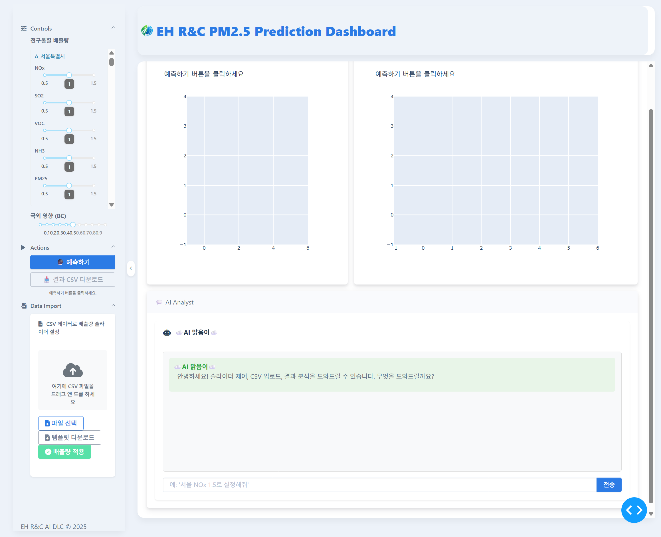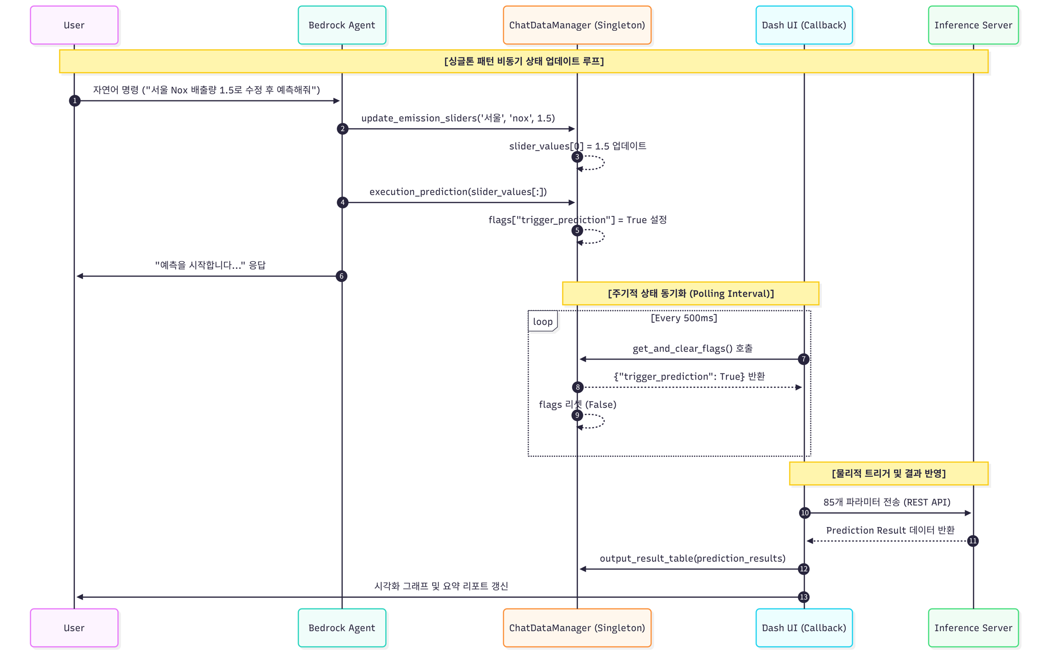 update_emission_slider와 같은 제어 함수를 도구(Tool)로 제공하여, 사용자의 자연어 명령을 해석하고 시스템의 파라미터를 조절하거나 예측 프로세스를 실행하는 자율적 제어 기능을 구현했습니다.