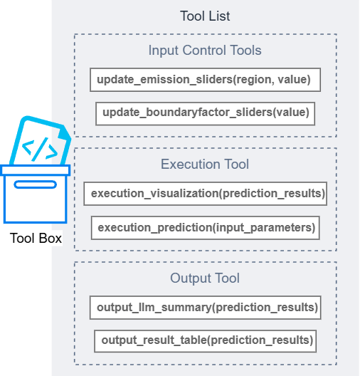 update_emission_slider와 같은 제어 함수를 도구(Tool)로 제공하여, 사용자의 자연어 명령을 해석하고 시스템의 파라미터를 조절하거나 예측 프로세스를 실행하는 자율적 제어 기능을 구현했습니다.