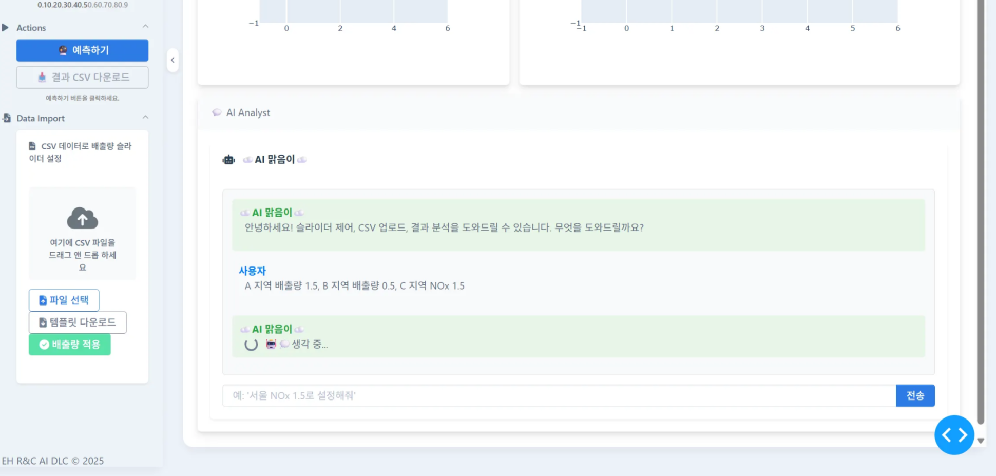 CMAQ Canvas의 핵심 혁신은 복잡한 UI 조작 없이 자연어 명령만으로 시뮬레이션을 수행할 수 있다는 점입니다. 예를 들어, 사용자가 “A 지역 배출량 1.5, B 지역 배출량 0.5, C 지역 NOx 1.5″라고 입력하면, Amazon Bedrock Agent가 이를 해석하여 자동으로 해당 슬라이더 값을 조정합니다. 이후 “예측 수행”이라는 간단한 명령만으로 시뮬레이션이 실행되고, 결과가 시각화되어 화면에 표시됩니다.
