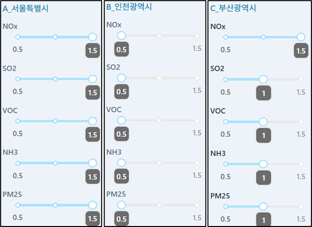 - 먼저 입력 설정 영역에서는 전국 17개 지역(서울특별시부터 세종특별자치시까지)의 5가지 전구물질(NOx: 질소산화물, SO2: 이산화황, VOC: 휘발성유기화합물, NH3: 암모니아, PM2.5: 초미세먼지) 배출량을 조정할 수 있는 85개의 슬라이더와 국외 유입 영향을 조정하는 1개의 슬라이더(0.0 ~ 1.0 사이의 값, 국외 유입 영향을 조정하는 슬라이더)를 제공합니다.