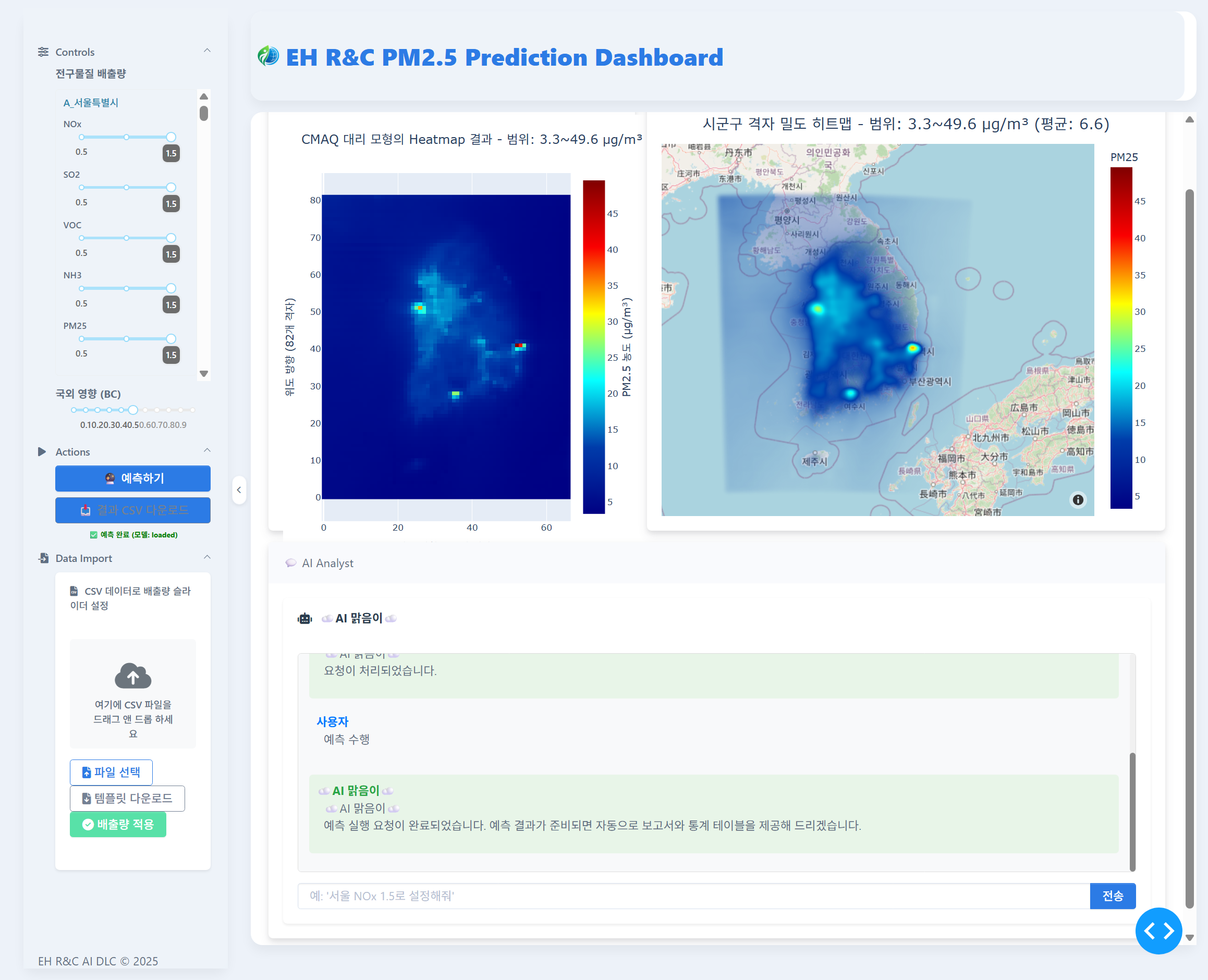 CMAQ Canvas는 EHRNC의 CMAQ 대리 모델을 활용한 지능형 대기오염 예측 대시보드로, 사용자가 자연어로 시뮬레이션을 제어하고 결과를 즉시 확인할 수 있는 혁신적인 플랫폼입니다.