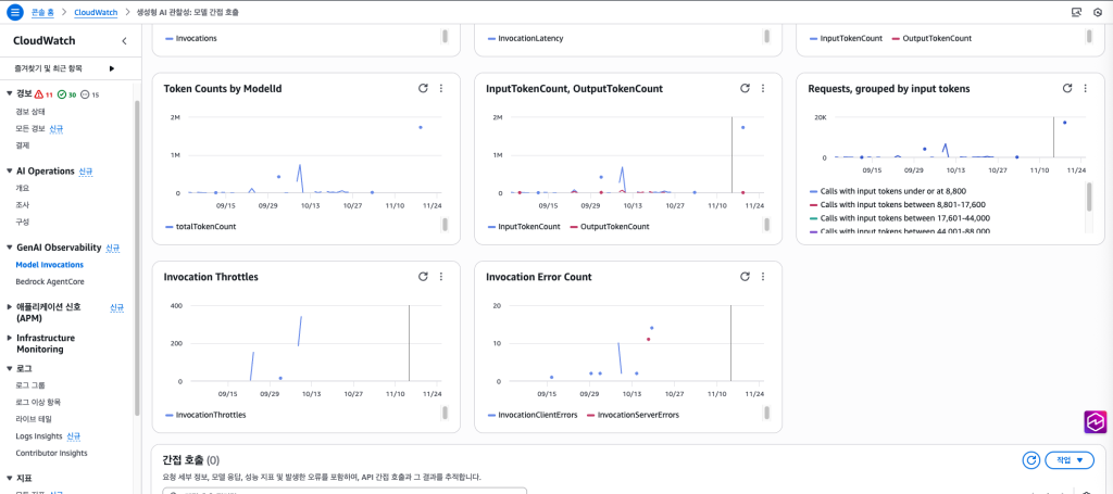 InvocationThrottles는 특히 중요한데, 이 값이 증가하면 현재 할당량(TPM/RPM)이 워크로드에 비해 부족하다는 신호입니다. 할당량 증가 요청을 고려하거나 CRIS(Cross-Region Inference)를 활용해야 합니다.