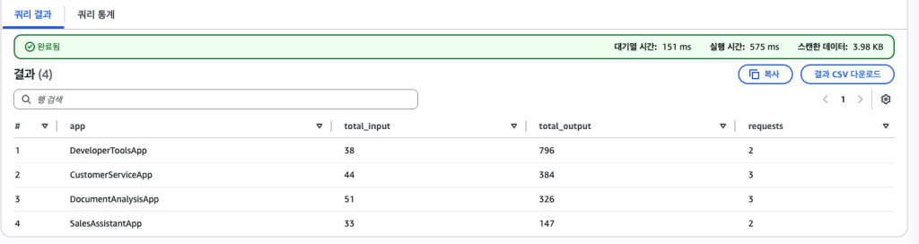 S3-Athena를 연동하면, SQL 쿼리로 기간별, LLM 모델별로 input/output 토큰수를 쉽게 파악할수 있습니다.