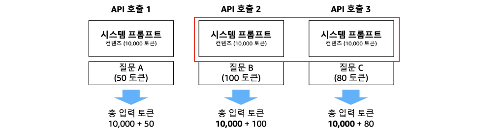 프롬프트 캐시는 LLM에서 동일하거나 유사한 프롬프트 요청에 대해 기존 결과를 재사용하는 기술입니다. 상황에 따라 다르지만 반복적인 프롬프트 요청 상황에서는 약 90%의 추론 처리 비용 절감과 85%의 응답 속도 개선 효과를 보입니다. 아래 그림은 3가지 API 호출 시나리오를 보여줍니다. 각 호출은 시스템 프롬프트(10,000 토큰)와 개별 질문(50-100 토큰)으로 구성되며, 매 API 호출마다 동일한 시스템 프롬프트가 반복되어 토큰이 비효율적으로 사용되는 상황을 나타냅니다. 프롬프트 캐시를 사용하면 API 호출 2와 3에서는 개별 질문에 해당하는 토큰만 처리하면 되므로, 비용 절감과 속도 개선을 동시에 이룰 수 있습니다.
