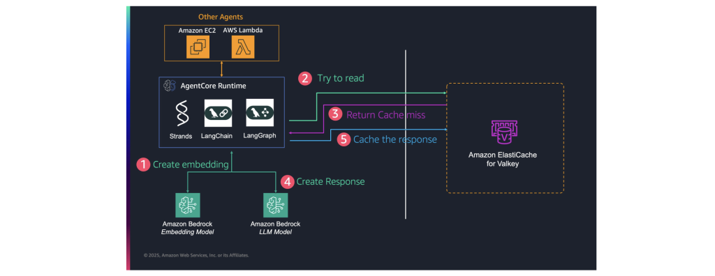 비용과 시간을 절약하기 위한 또 다른 캐싱 방법으로 시맨틱 캐시가 있습니다. 프롬프트 캐싱처럼 정확한 문자열을 매칭하는 방식이 아닌, 벡터 임베딩을 사용하여 의미적으로 유사한 쿼리들을 식별하고 이전에 생성된 응답을 재사용합니다. 예를 들어, IT 헬프데스크 챗봇에서 수천 명의 사용자가 같거나 비슷한 질문을 할 때, 매번 LLM을 호출하지 않고 캐시된 응답을 재활용할 수 있습니다. 실험 결과에 따르면 이 방식으로 LLM 추론 비용을 최대 86%, **쿼리 응답 지연 시간을 최대 88%**까지 줄일 수 있었습니다. 아래 이미지는 Amazon AgentCore Runtime을 중심으로 한 시맨틱 캐싱 아키텍처의 워크플로우를 보여줍니다. 주요 프로세스는 다음과 같은 5단계로 구성됩니다: