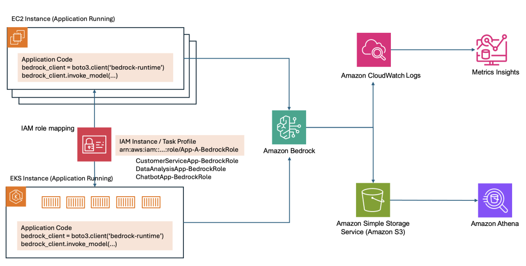 만약 서비스를 모두 런칭하신 이후, 애플리케이션을 수정하기 어려운 경우, IAM Role의 ARN에 애플리케이션별로 Role을 설정해서 애플리케이션 토큰 사용량을 확인하는 방법도 있습니다. 이렇게 하면 애플리케이션의 변경 없이도 쉽게 각 애플리케이션별 토큰사용량을 측정할수 있습니다. identity.arn 부분에 application 또는 팀별, 프로젝트별로 구분해서 다양한 사용량 분석을 할수 있습니다. IAM Role 네이밍 규칙 예시는 {ApplicationName}-BedrockRole 와 같은 방식으로 하면 됩니다. 고객서비스, 데이터분석, 챗봇서비스와 같은 형태 말고도, 프로젝트, 팀단위 별로도 롤을 부여하고 사용량을 체크할 수 있는 등 여러가지 다양한 측면의 분석이 쉽게 가능해집니다. Application들이 이미 사용되고 있다는 가정 하에, 소스코드를 수정하지 않고 IAM Role을 추가하려면 다음과 같은 과정을 거치면 되겠습니다.Figure 5. Bedrock 사용량 수집/저장/분석 아키텍쳐