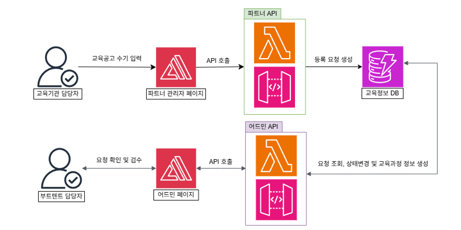 기존에는 교육기관 담당자가 AWS Amplify로 배포된 교육기관용 관리자 페이지에 접속하여 모집 정보를 직접 입력하는 방식이었습니다. 입력된 데이터는 REST API → Amazon API Gateway → AWS Lambda를 거쳐 비즈니스 로직 및 유효성 검증 후 Amazon DynamoDB에 저장됩니다. 저장된 정보는 부트텐트 내부 운영진의 2차 검수를 거친 뒤 최종 등록되는 구조입니다.
