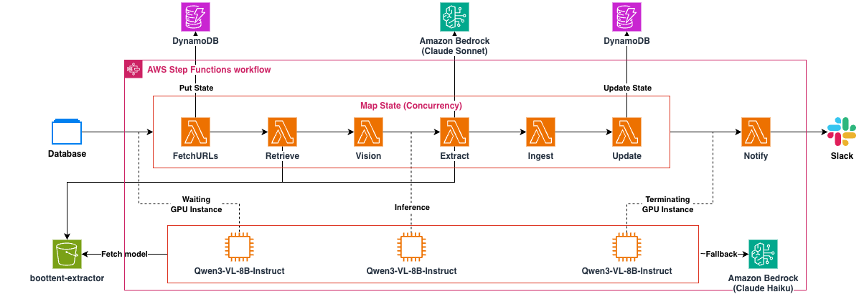 부트텐트는 Amazon Bedrock과 AWS Step Functions 기반의 자동화 파이프라인을 구축하여, 교육과정 등록에 소요되는 시간을 약 69.0% 절감하고 필드 정확도 88.7%를 달성했습니다. Vision OCR 비용은 Claude 4.5 Haiku 대비 약 40% 절감했습니다.