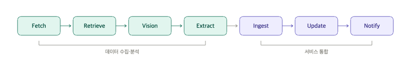 앞서 소개한 1단계(Fetch) → 2단계(Retrieve) → 3단계(Vision) → 4단계(Extract) 파이프라인에 이어, Extract 단계에서 생성된 구조화 JSON을 실제 서비스 시스템과 연결하는 5단계(Ingest) → 6단계(Update) → 7단계(Notify) 를 구현했습니다.
