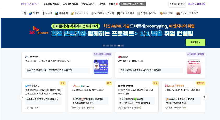 부트텐트는 부트캠프와 국비교육 등 SW∙AI 분야의 직무 교육 정보를 한곳에서 탐색할 수 있는 플랫폼입니다. 사용자는 현재 모집 중인 교육 과정을 확인하고, 분야·비용·일정 등 원하는 조건에 맞춰 교육을 비교할 수 있습니다.