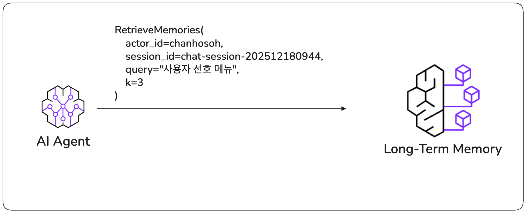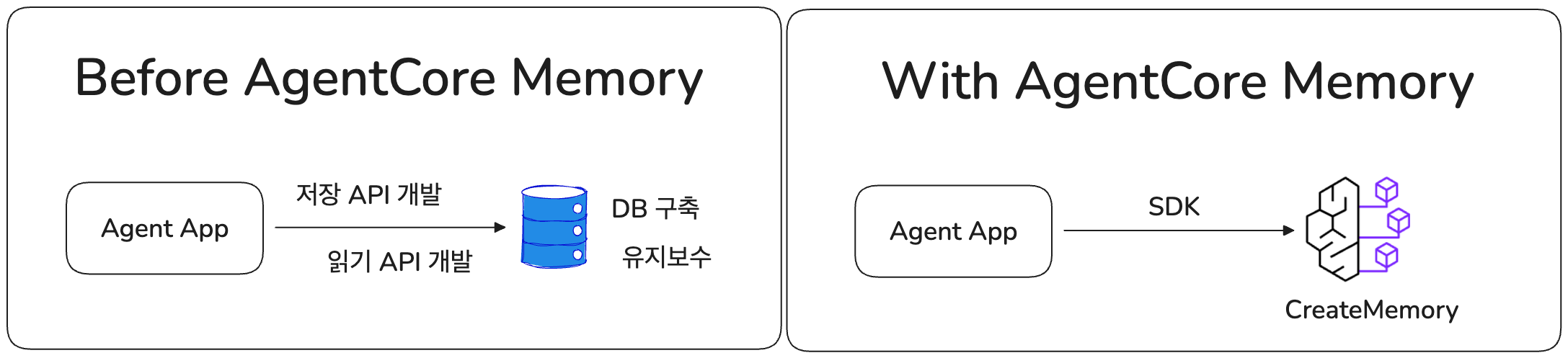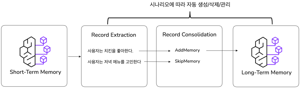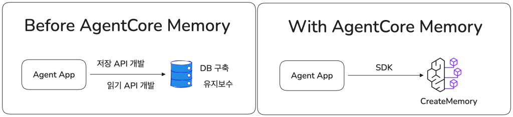 앞서 언급했듯, 에이전트의 기억을 직접 구현하려면 외부 데이터베이스를 구축하고 관리해야 하는 부담이 있습니다. 특히 장기 기억을 위해서는 대화 내용을 요약하거나 저장된 기억을 업데이트/삭제하는 로직, 그리고 이를 처리할 LLM 호출 프로세스까지 모두 직접 개발해야 합니다. AgentCore Memory는 이 모든 복잡한 과정을 추상화하여, 개발자가 SDK를 통해 간편하게 구현할 수 있도록 도와줍니다.