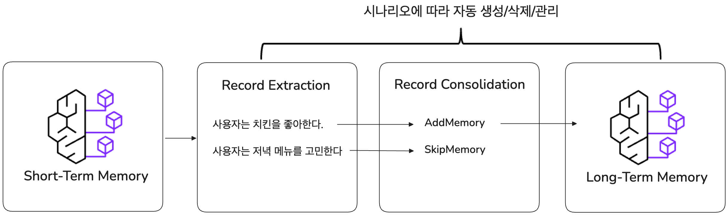 - 추출 예: “에이전트가 저녁 메뉴로 치킨, 피자, 족발을 추천했고, 사용자는 치킨을 먹었습니다.”