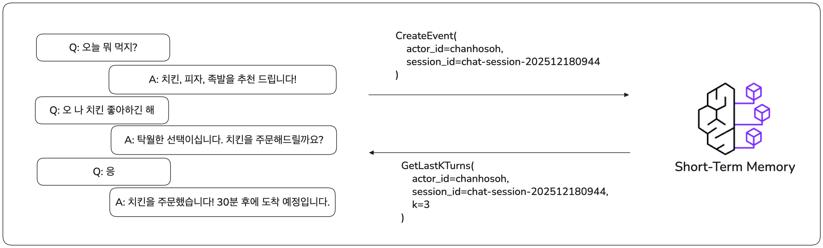 이처럼 Short-term Memory는 턴(Turn) 단위로 원자적(Atomic)하게 저장되며, 리스트의 순서를 엄격하게 보장하여 대화의 흐름이 뒤섞이는 것을 방지합니다.