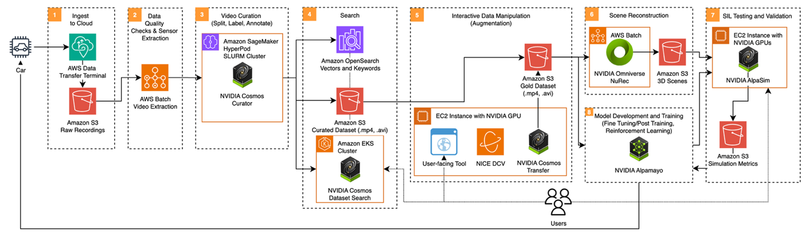 AWS 관리형 서비스(Amazon S3, AWS Batch, Amazon SageMaker HyperPod, Amazon EKS, Amazon OpenSearch Service, Amazon EC2 + Amazon DCV)와 NVIDIA AV 기술(Cosmos Curator, Cosmos Dataset Search, Omniverse NuRec, Alpamayo)을 결합하여, 고객은 원시 Fleet 데이터에서 검증된 주행 모델까지의 End-to-End 파이프라인을 구축할 수 있습니다.