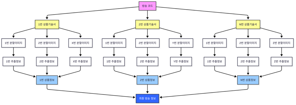 추출된 개별 정보들은 다시 통합 과정을 거쳐 각 상품별로 완전한 상품 정보가 구성됩니다.최종적으로 모든 상품의 정보는 하나로 취합되어 홈쇼핑 방송 정보로 통합됩니다.