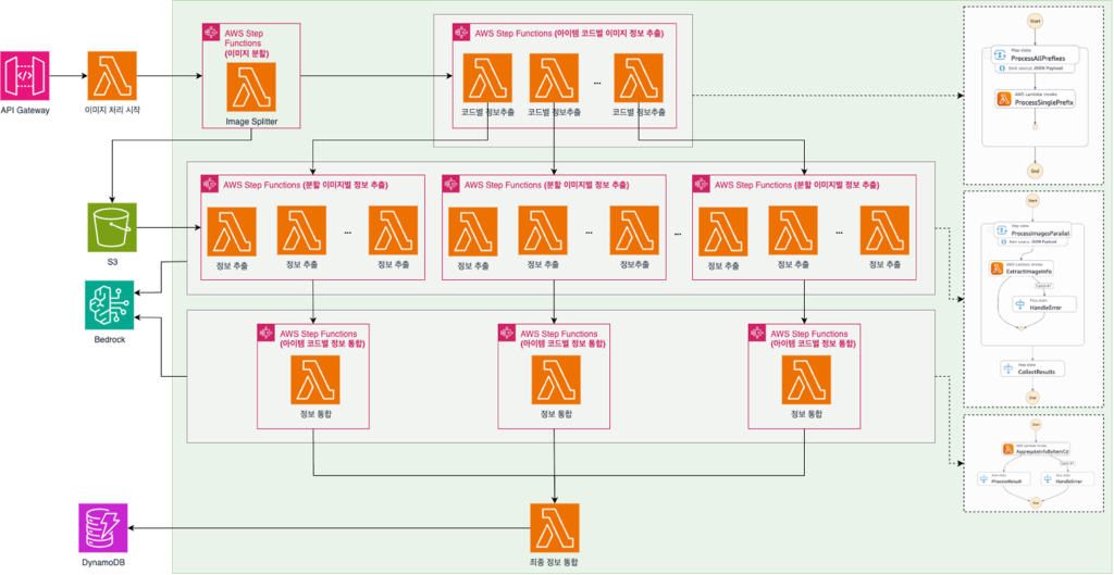 - 1단계: 이미지 분할 처리대용량 상품 기술서 이미지들을 멀티모달 모델이 처리할 수 있는 최적 크기로 병렬 분할하여 Amazon S3에 저장합니다.