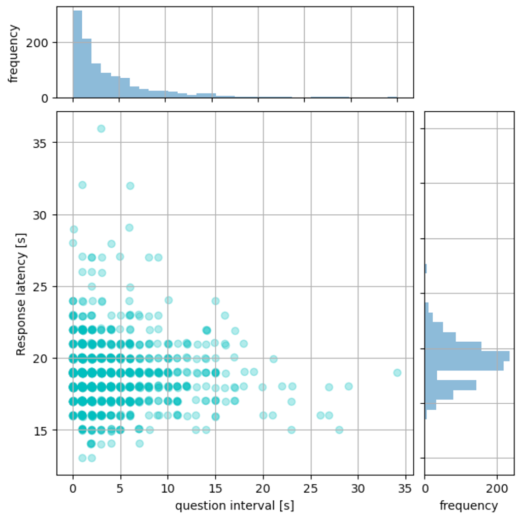 아래 그래프에서 수평축(question interval)은 이전 질문으로부터 경과시간을 의미하며, 이 값이 작을수록 단시간 내에 많은 질문이 집중되는 높은 트래픽 상황을 나타냅니다. 수직축은 AI 처리시간(Response latency)을 보여주며, 이는 시청자가 질문 후 답변을 받기까지의 소요 시간입니다.