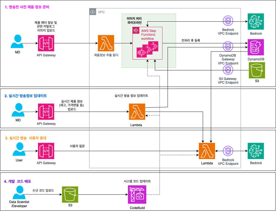 실시간으로 방송 중 변경되는 정보(재고, 가격 등)는 별도의 업데이트 파이프라인을 통해 동일한 DynamoDB에 즉시 반영됩니다.