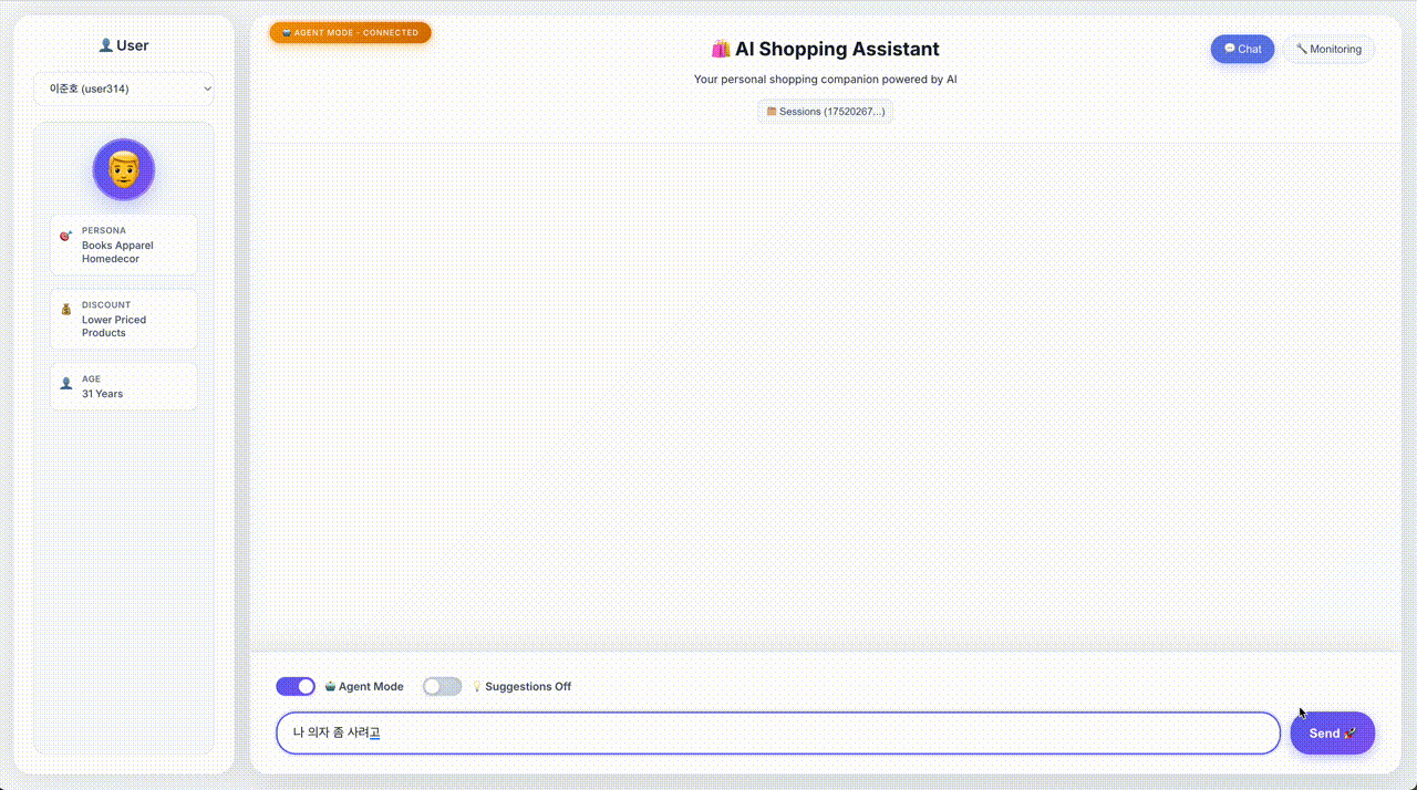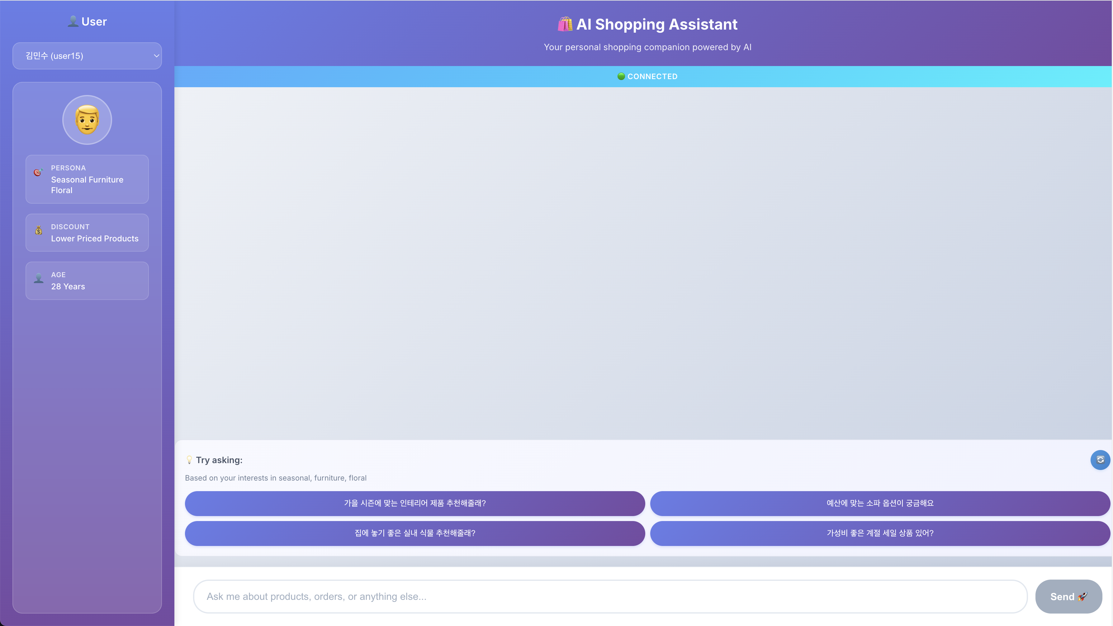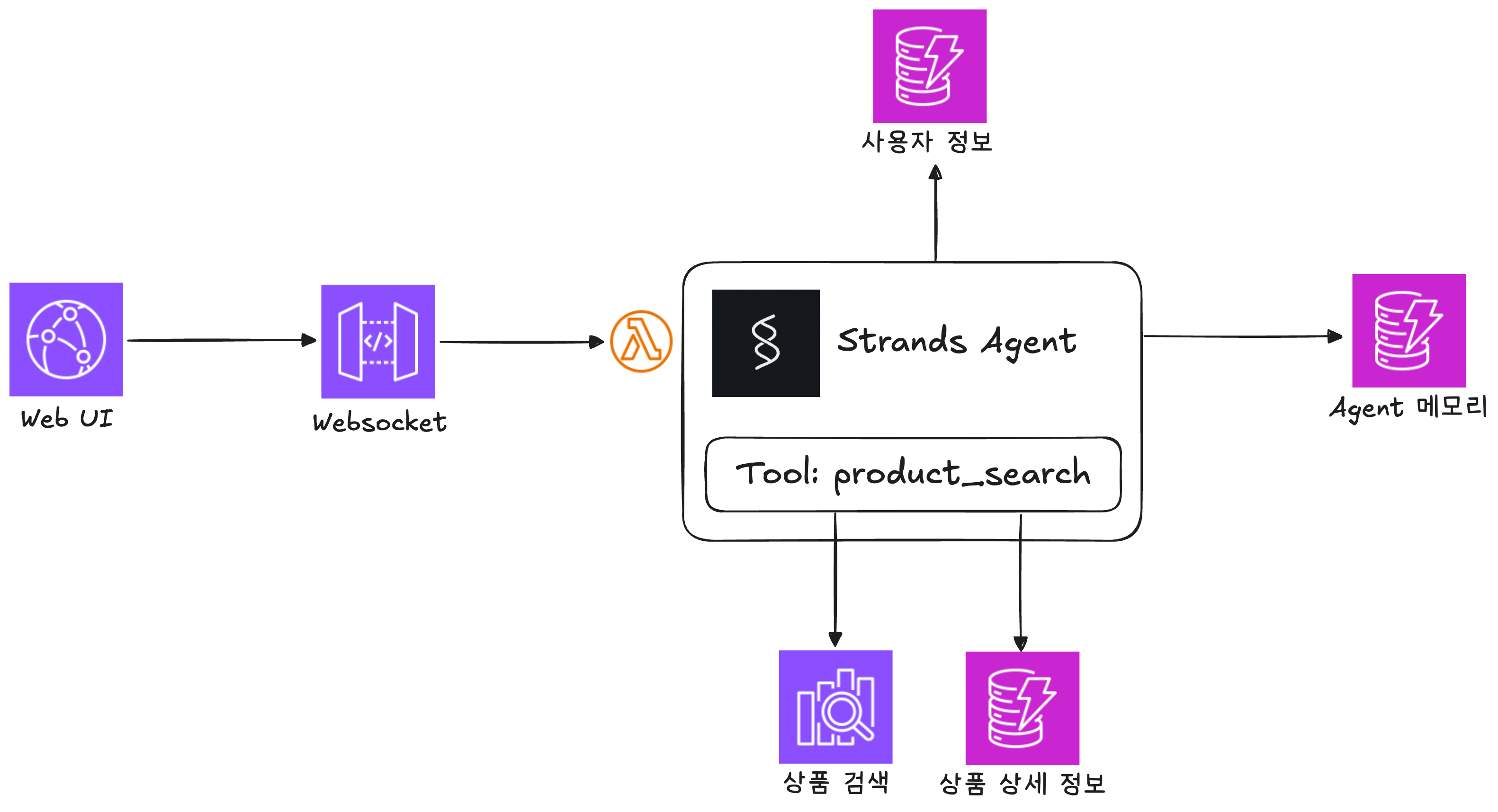 위 기술들을 기반으로 Strands Agent를 이용하여 쇼핑 어시스턴트를 만들었습니다. 주문 조회, 상품 검색, 상세 정보, 상품 리뷰 정보, 상품 비교 등 다양한 기능들을 Agent 기반으로 수행할 수 있습니다.