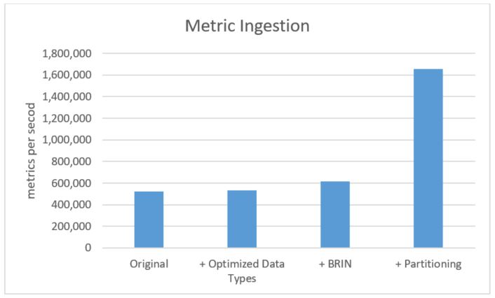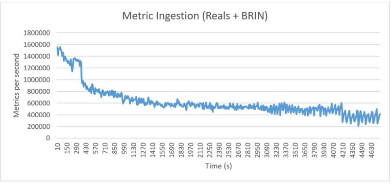 시간 열에 B-Tree 인덱스 대신 BRIN 인덱스를 사용함으로써 데이터베이스 크기가 126GB에서 101GB (-19.8%)로 감소했습니다. 두 BRIN 인덱스의 크기는 각각 24KB에 불과합니다. 이렇게 크게 줄어든 인덱스의 크기는 메트릭 수집 성능 향상으로 직접 이어집니다. BRIN 인덱스를 사용하여 메트릭을 로드하면 시간이 5,487초에서 4,761초로 12분 더 단축되며, 초당 616,002개의 속도로 메트릭을 수집할 수 있습니다.