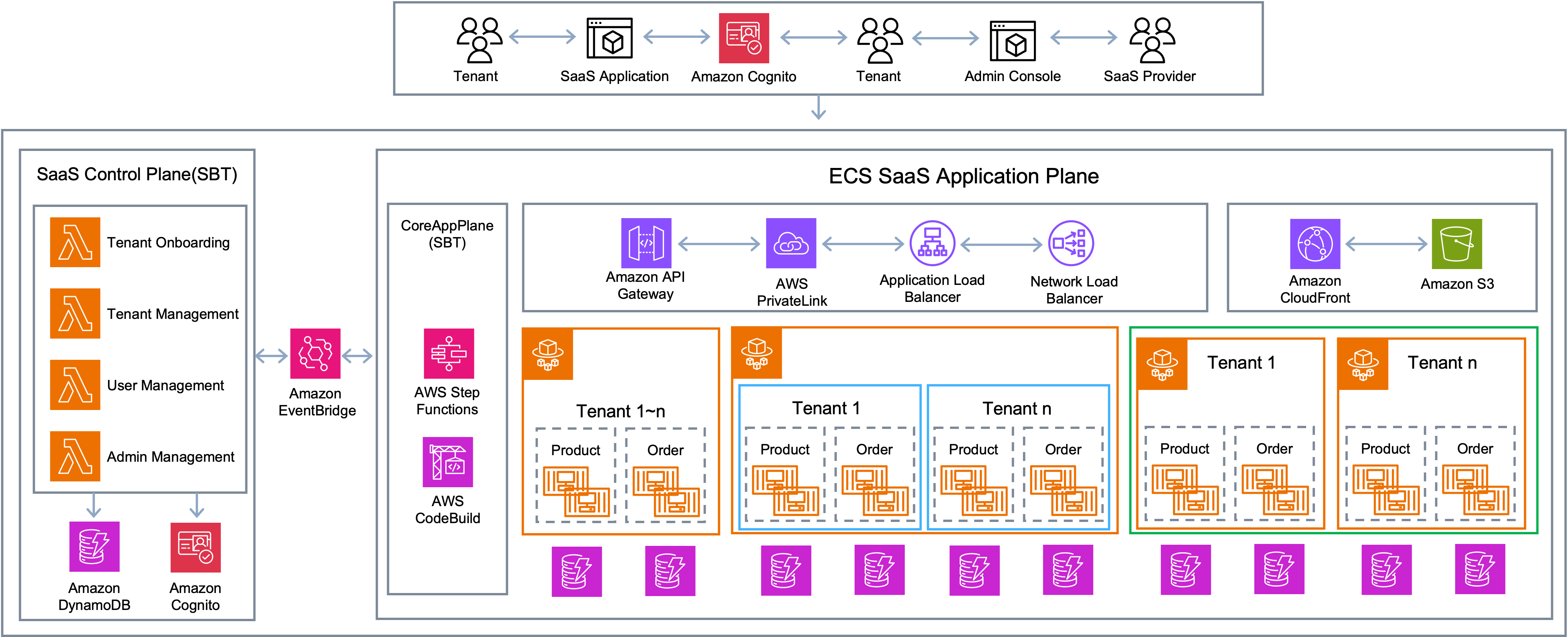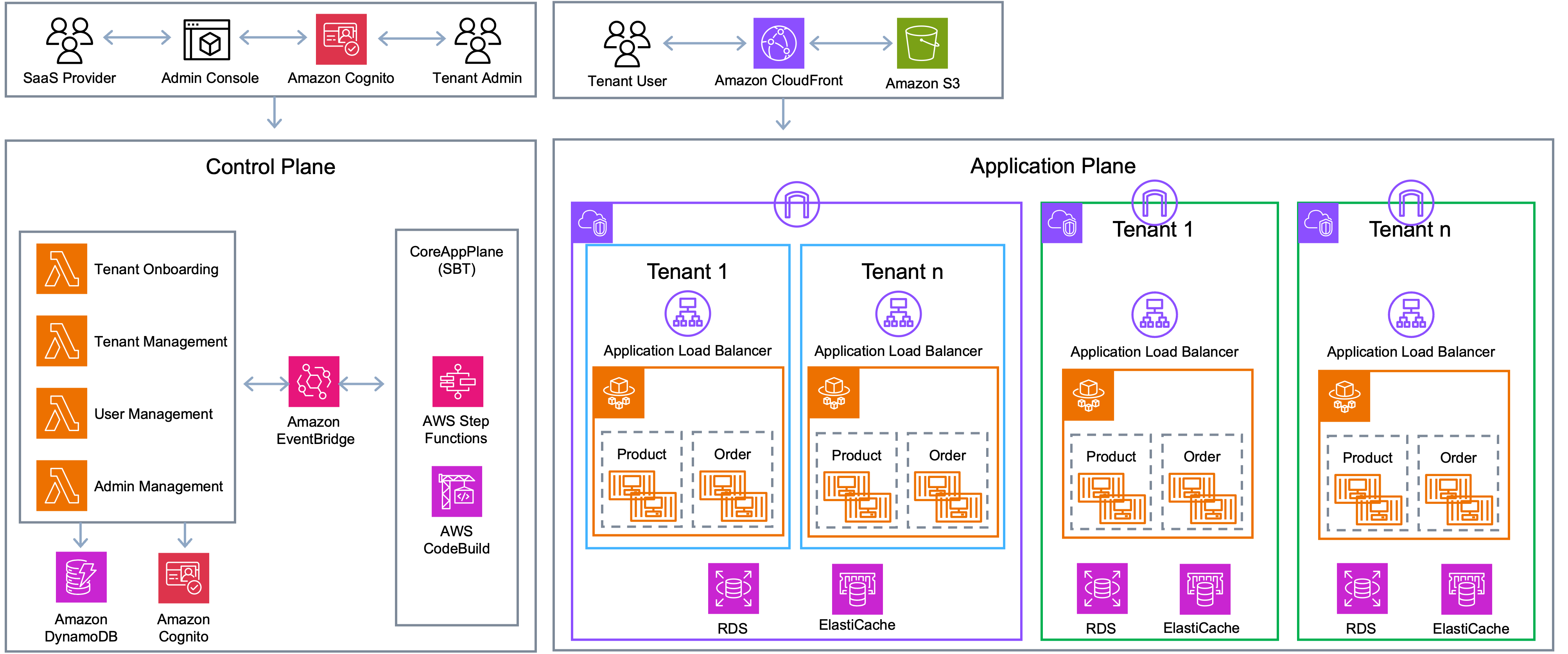 SBT의 핵심 설계 원칙은 Control Plane과 Application Plane의 명확한 분리입니다. Control Plane은 테넌트 온보딩, 사용자 관리, 청구 관리 등 SaaS 운영에 필요한 관리 기능을 담당하고, Application Plane은 실제 비즈니스 로직이 동작하는 애플리케이션 영역을 담당합니다. 두 영역은 Amazon EventBridge를 통한 이벤트 기반 아키텍처로 연결되어, 각각 독립적으로 확장하고 관리할 수 있는 구조를 제공합니다.