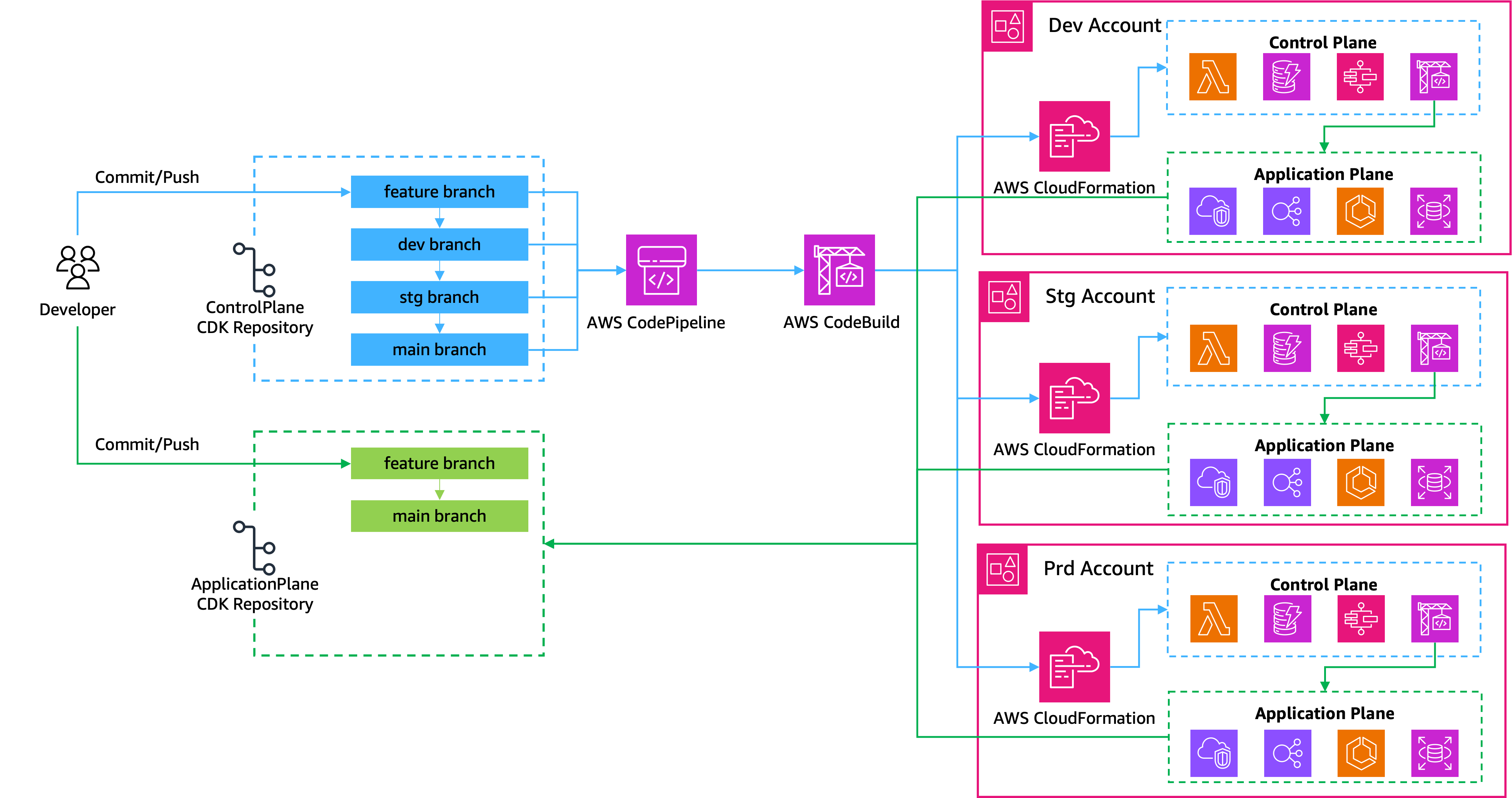SaaS 환경에서는 동일한 인프라를 반복적으로, 그리고 일관성 있게 배포할 수 있어야 합니다. 이를 위해 AWS CDK를 활용하여 모든 인프라스트럭처를 코드로 정의했습니다. 특히 인상적이었던 부분은 테넌트별 리소스를 템플릿화할 수 있다는 점입니다. Control Plane에서 새로운 테넌트 생성 요청이 들어오면, 미리 정의된 CDK 템플릿을 기반으로 해당 테넌트에 필요한 모든 AWS 리소스가 자동으로 생성됩니다. 이는 수동 작업으로 인한 실수를 방지하고, 일관된 품질의 인프라를 보장해주었습니다.