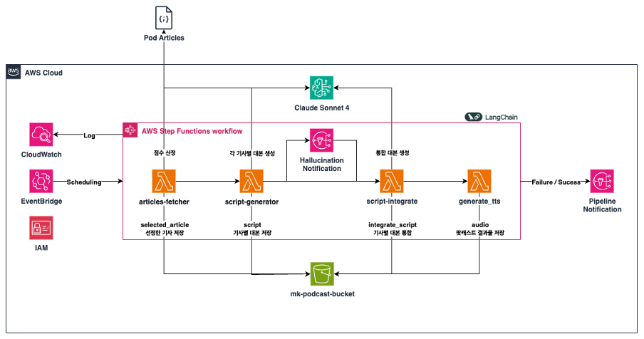 AI 기반 팟캐스트 시스템은 크게 LLM을 이용하기 위한 Amazon Bedrock과 콘텐츠 생성을 위한 단계별 로직을 수행하는 Amazon Step Functions로 이루어져 있습니다.
