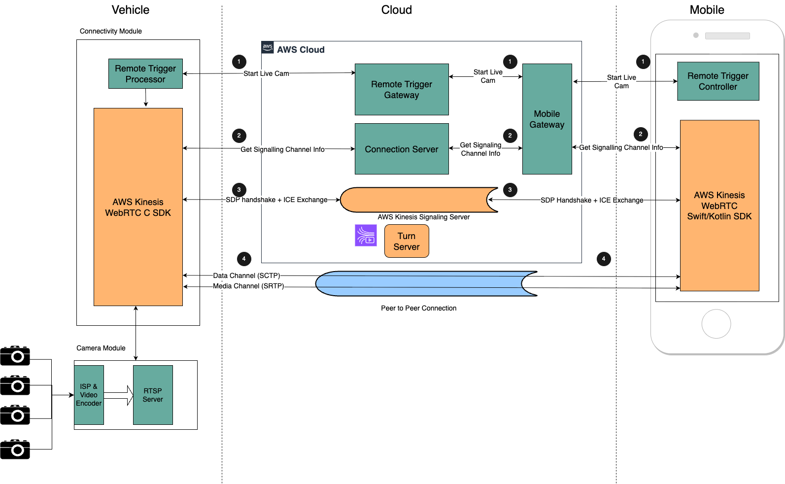 | 3 | Amazon Kinesis Video Streams 시그널링 채널은 ICE(Interactive Connectivity Establishment) 를 지원합니다. ICE는 차량과 모바일 앱 간 피어 투 피어(P2P) IP 주소를 대화형으로 탐색해 직접 연결을 시도하며, 필요 시 Amazon Kinesis Video Streams의 WebRTC TURN 서버를 통한 릴레이 연결로 전환됩니다. 또한 차량 카메라 스트리밍과 모바일 뷰어 애플리케이션은 SDK 핸드셰이크로 시작하며, 이 과정에서 직접 또는 간접 연결을 통해 전송될 비디오 스트림의 매개변수가 설정됩니다. |