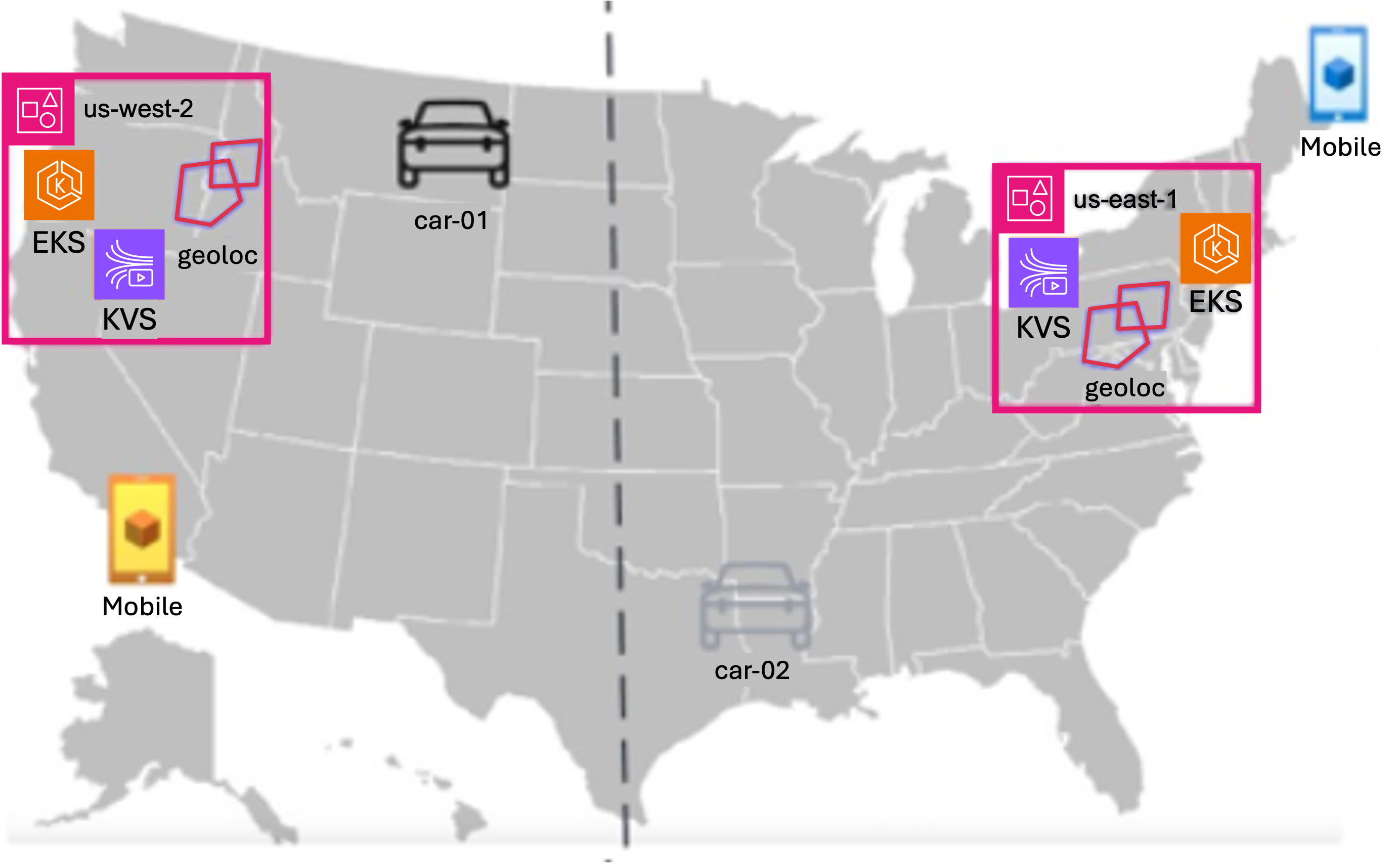 구현을 최적화하기 위해, us-east-1과 us-west-2 리전에 모두 배포된 Amazon Elastic Kubernetes Service(Amazon EKS) 기반의 클라우드 서비스는 커스텀 지리적 위치 기반 서비스(geolocation)를 사용합니다. 이 지리적 위치 기반 서비스는 차량이 캔자스주 리바논(Lebanon, Kansas; 39°50′N 98°35′W) 을 기준으로 동쪽에 있는지 서쪽에 있는지를 식별하는 데 도움을 줍니다. AWS와 Rivian은 이 지점을 미국의 중간 지점으로 간주했으며(그림 4의 점선으로 표시), 서비스는 이를 기준으로 차량이 위치한 리전과 동일한 애플리케이션 공존(co-located) 리전에서 Amazon Kinesis Video Streams 시그널링 채널을 프로비저닝하도록 합니다. 위 예시(그림 4)에서는 모바일이 동부 해안에 있든 서부 해안에 있든 관계없이 car-01은 us-west-2에 시그널링 채널이 설정됩니다. 마찬가지로 car-02는 us-east-1 리전에 설정됩니다.