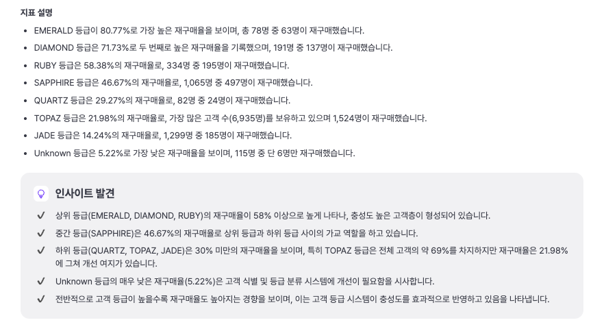 - 업무 효율성 대폭 향상: 복잡한 엑셀 작업이나 분석가 요청 대기 시간 없이 즉시 분석 결과를 얻을 수 있게 되어 업무 속도가 크게 개선되었습니다.