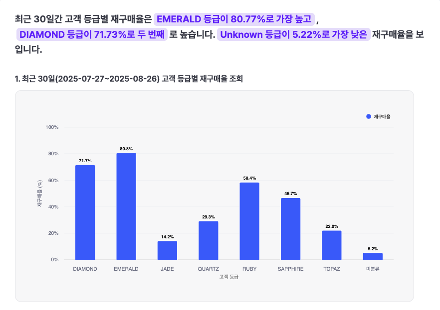 또한 “주요 구매 요일과 시간대 분석”이라는 질문은 복합적인 분석을 요구합니다. 앞서 아키텍처에서 설명한 Question Agent는 이 의도를 파악하고, 분석을 논리적인 최소 단위로 분할합니다.