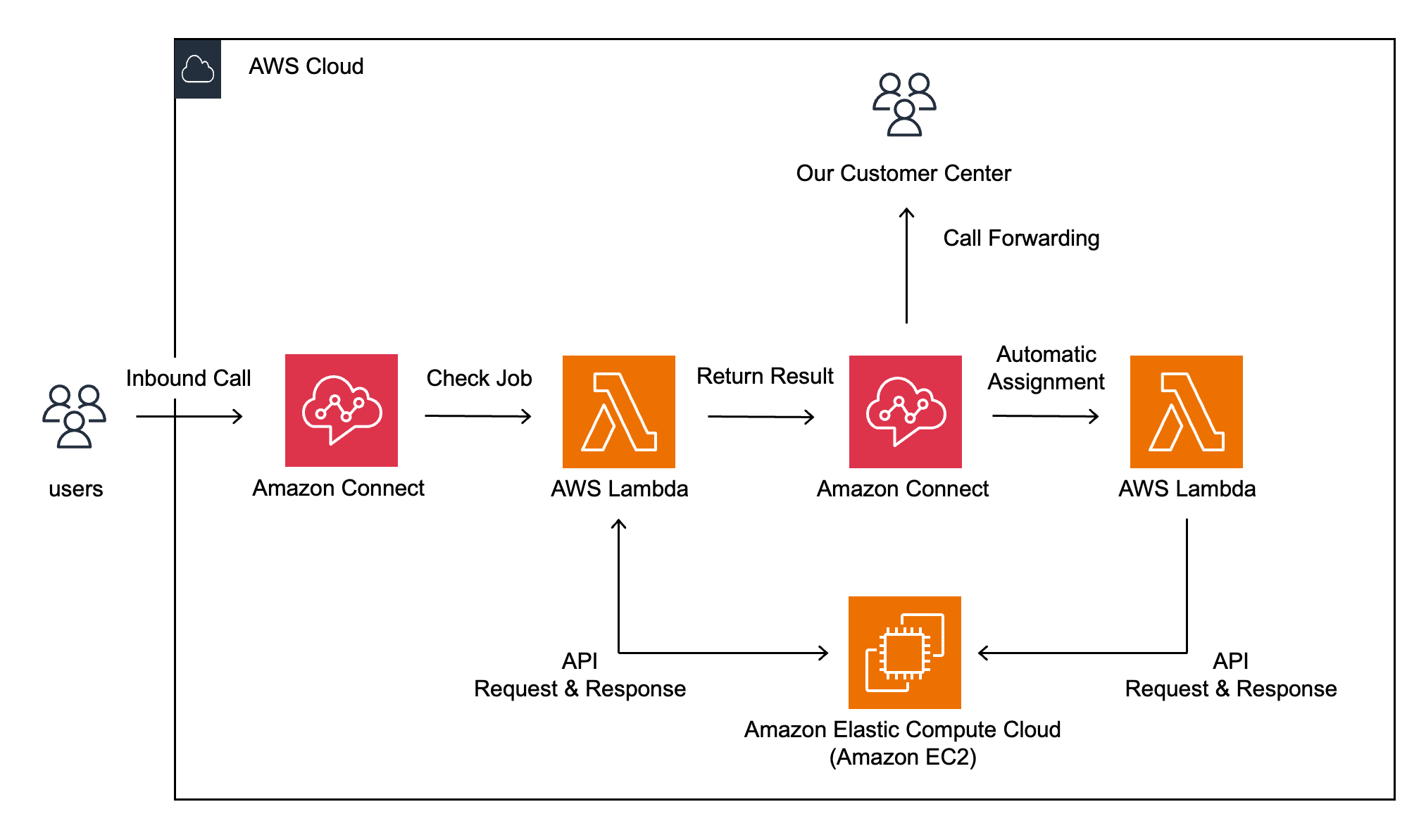 첫 번째 시나리오인 인바운드 기사 자동 배정은 아래 아키텍처와 같이 Amazon Connect와 AWS Lambda를 중심으로 구현할 수 있었습니다. Amazon Connect를 통해 전화가 인입되면, Lambda 함수를 호출하여 발신자 번호를 통해 기사님을 식별하고, 요청된 건이 배차 확정이 가능한지를 EC2 서버에 요청을 보내 조회함으로써 배정 가능한 업무 정보를 실시간으로 조회하는 과정을 거칩니다.