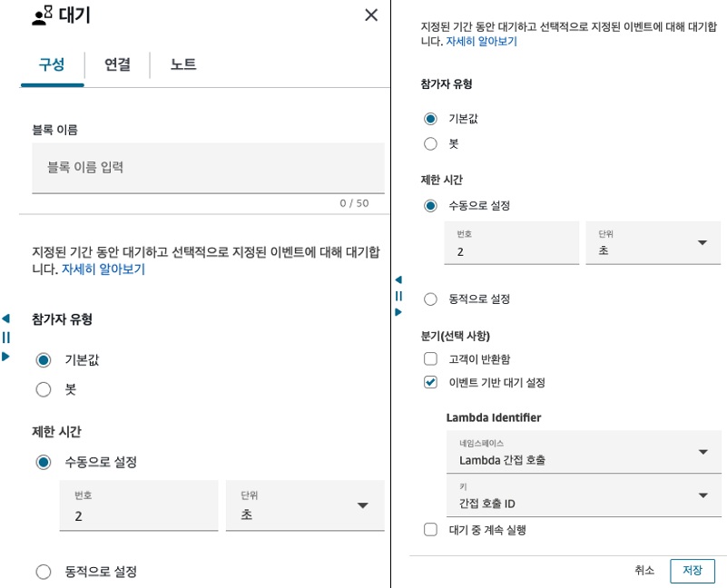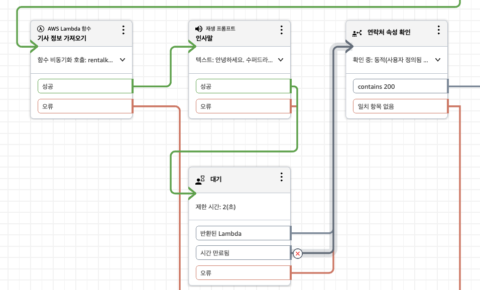 디지털 콜센터의 경우 필요한 로직을 뒷단에서 알맞게 처리하면서도 고객에게 빠르게 응답하도록 구성하는 것이 중요하기에, IMS 개발팀은 여러 번의 테스트를 통해 몇 초의 제한시간을 두는 게 고객 경험에 있어 적합한지 검토하는 과정을 거쳤습니다. 이에 통화를 시작할 때 기사님 정보를 가져오고 연락처 속성을 확인하는 초기 로직은 3초 간의 안내 멘트 재생을 포함해 최대 5초 안에 응답을 받아 처리하도록 했으며 (대기 2초 이내에 응답 시 다음 단계로 진행), Lambda로부터 받은 응답 값에 따라 다음 프로세스가 진행되도록 설계했습니다. 아래 [Figure 3]와 같이 Flow Designer에서 제공하는 손쉬운 UI를 통해 각 노드 별 몇 초의 제한시간을 둘 지, 언제 어떤 이벤트가 발생했을 때 Lambda 로직을 수행할 것인지와 같은 구성을 상세히 설정할 수 있었습니다.
