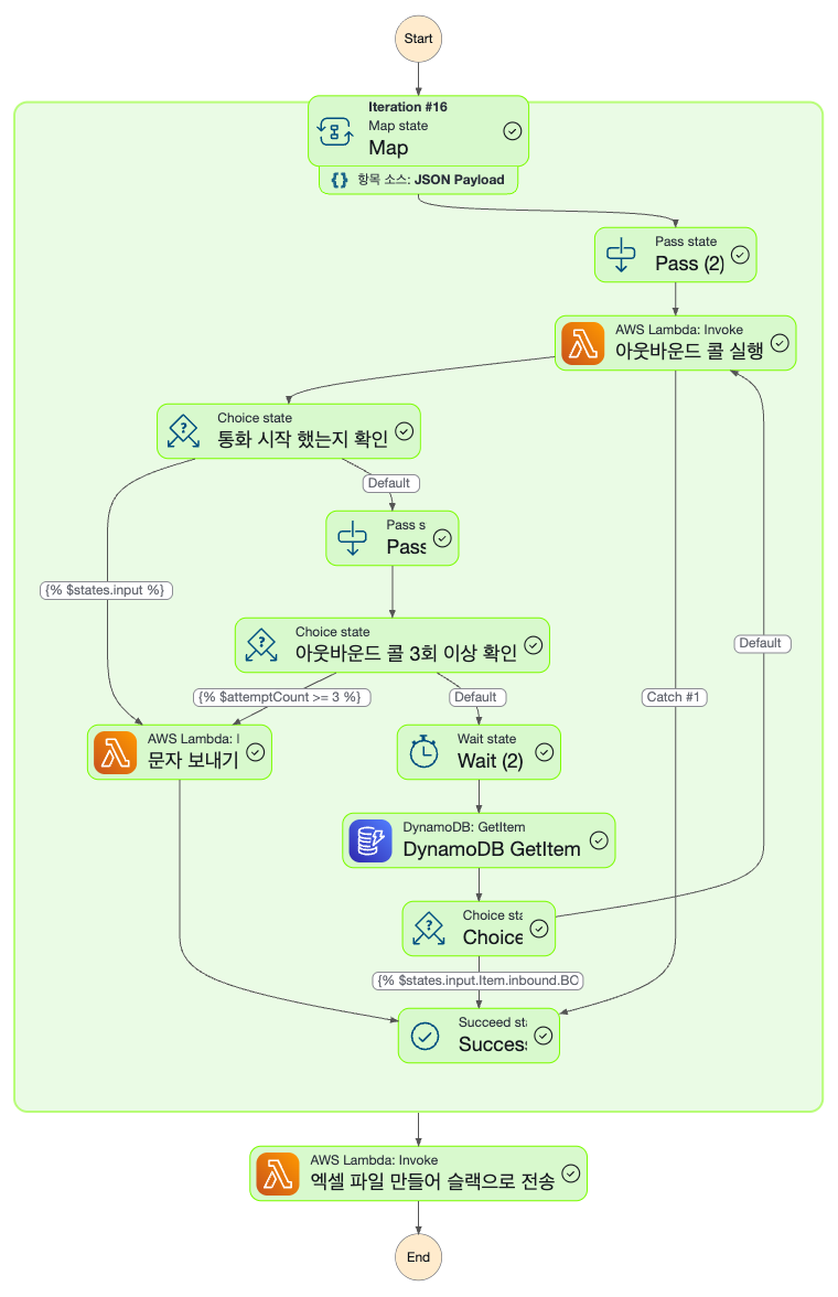 - ‘엑셀 파일 만들어 슬랙으로 전송’ Lambda 함수: 100회의 동시 요청이 모두 완료되었다면, 해당 state로 넘어가 각 통화 연결에 대한 정보를 Lambda 함수가 엑셀 파일에 저장하고 슬랙으로 결과를 전송하며 상태머신이 종료됩니다.