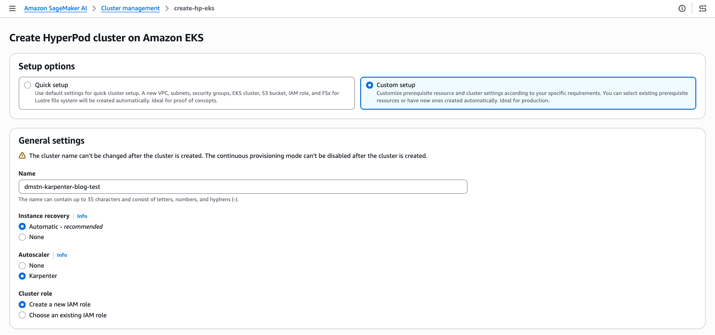 먼저 SageMaker HyperPod EKS 클러스터를 시작 및 구성하고, 클러스터 생성 시 continuous provisioning 모드가 활성화되어 있는지 아래 순서로 확인합니다.