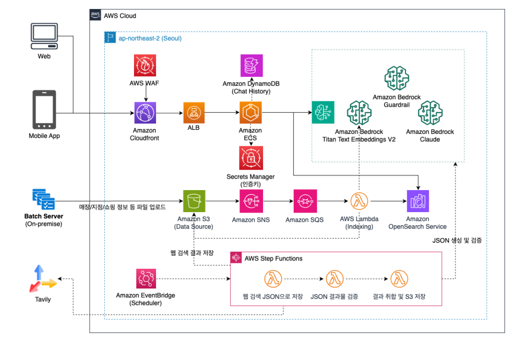 온프레미스 배치 서버: 매장정보, 지점정보, 쇼핑뉴스 등 데이터를 JSON 파일로 생성하여 S3에 업로드