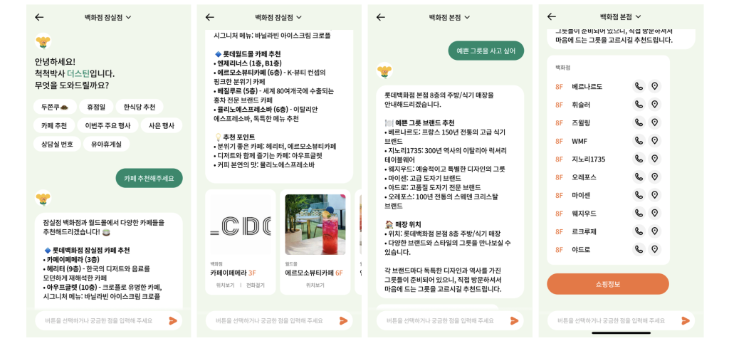 더스틴의 기능을 한눈에 확인해볼 수 있도록 서비스 화면을 우선 살펴보겠습니다. 초기 화면에서는 “휴점일”, “한식당 추천”, “카페 추천” 등 자주 묻는 질문들을 빠른 버튼으로 제공하여, 타이핑이 익숙하지 않은 고객도 쉽게 서비스를 이용할 수 있도록 하였습니다. 만약 고객이 “카페 추천해주세요”라고 요청하면, 현재 선택된 지점의 카페 정보를 층수와 함께 안내합니다. 또한 “예쁜 그릇을 사고 싶어”와 같이 특정 매장을 찾는 것이 아닌 쇼핑 목적으로 문의하는 경우에도, AI 컨시어지는 적절한 카테고리의 관련 브랜드를 추천합니다. 응답 시에는 텍스트 답변과 함께 카드형 UI로 매장 정보를 시각적으로 제공합니다. 각 카드에는 매장 이미지, 위치(동/층), 위치보기 및 전화걸기 버튼이 포함되어 있고, 카드 선택 시 해당 매장의 상세 안내 페이지로 이동하기 때문에 고객은 빠르게 연관 정보를 이어서 확인할 수 있습니다.