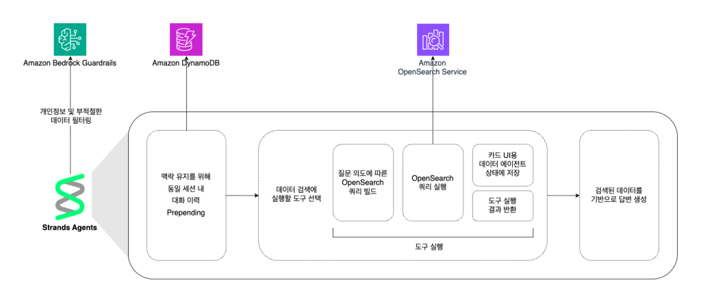 Amazon ECS에서 Strands Agents SDK 기반 에이전트 서버를 운영합니다. 에이전트 추론 시에는 Amazon Bedrock의 Anthropic Claude Haiku 모델을 사용하여 빠른 응답 속도와 비용 효율성을 확보하였습니다. Amazon Bedrock Guardrails를 통해 개인정보 및 부적절한 데이터는 필터링하여 에이전트가 해당 데이터를 처리하지 못하도록 차단하고, Amazon DynamoDB를 이용해 대화 이력을 관리하여 문맥을 유지합니다.