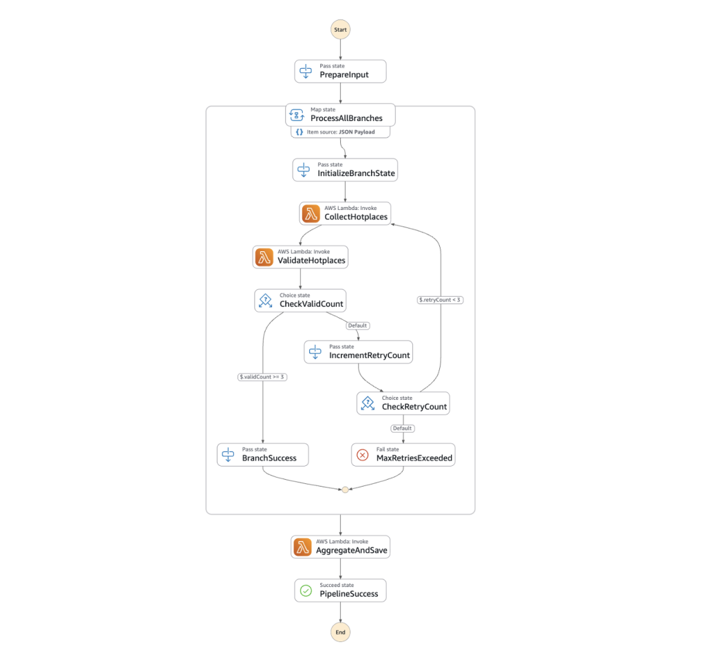 백화점 지점 주변의 최신 핫플레이스 정보 등 웹에서 검색된 데이터를 활용하기 위해서는 주기적으로 AWS Step Functions를 실행합니다. 검색 도구인 Tavily로 검색된 문서에서 Amazon Bedrock Claude Sonnet 및 Opus를 이용해 데이터를 추출하고 JSON으로 파싱하여, 다른 데이터와 동일하게 S3에 저장합니다.