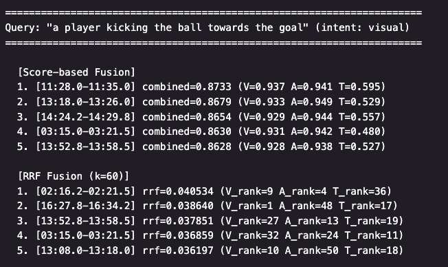 RRF는 점수 대신 순위를 사용함으로써 이러한 모달리티 간 점수 스케일 불균형 문제를 해소합니다. 아래는 Reciprocal Rank Fusion(RRF)의 공식이며, k는 순위 간 차이를 완화하는 상수(일반적으로 60), s는 비디오 세그먼트, m은 모달리티를 나타냅니다.