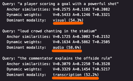 쿼리 의도와 무관한 고정 가중치 적용: visual을 0.8로 부여했다면 “군중 환호”와 같은 오디오 중심 쿼리에도 visual 가중치가 0.8로 적용되어 쿼리의 의도와 무관하게 시각 정보가 지배적입니다.