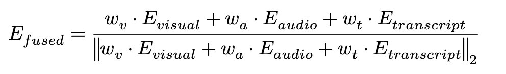 가장 단순한 방식으로 세그먼트 별 저장 시점에 3개 모달리티 임베딩을 하나의 벡터로 합칩니다. Marengo 3.0은 하나의 비디오 클립에 대해 visual, audio, transcription 세 개의 독립된 임베딩 벡터를 반환합니다. Fused 방식은 저장 시점에 3개 벡터를 가중 합산 후 세그먼트별 정규화하고 하나의 인덱스로 통합하는 것입니다. (세그먼트 별 모달리티가 없을 경우, 0으로 고정)