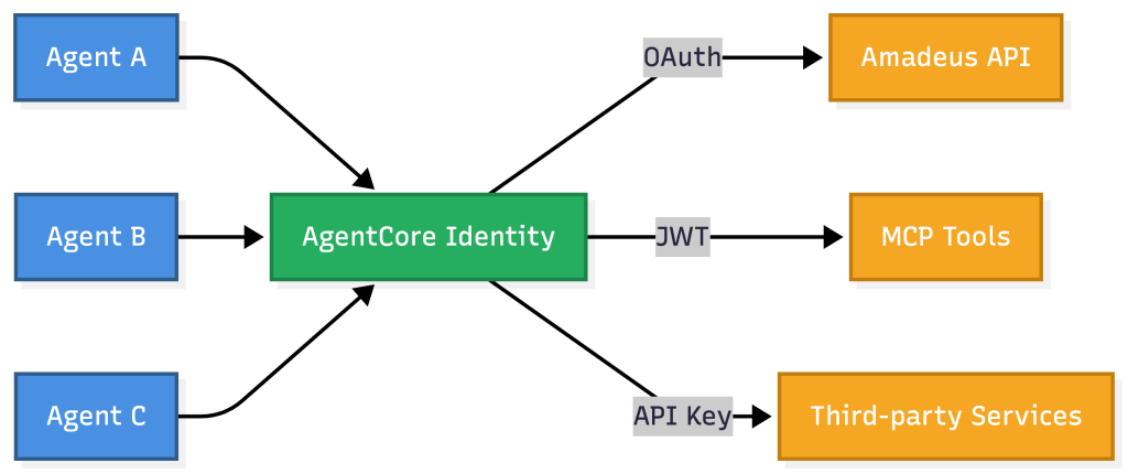 - AgentCore Identity: 에이전트의 신원을 안전하게 관리하고, 인증과 권한 위임을 표준화하는 레이어입니다. 사용자 마이그레이션이나 인증 흐름을 재구축하지 않고도, 에이전트별 인증과 접근 제어를 일관된 방식으로 적용할 수 있습니다. 이 글에서는 에이전트 인증을 중앙화하는 역할로 활용합니다.